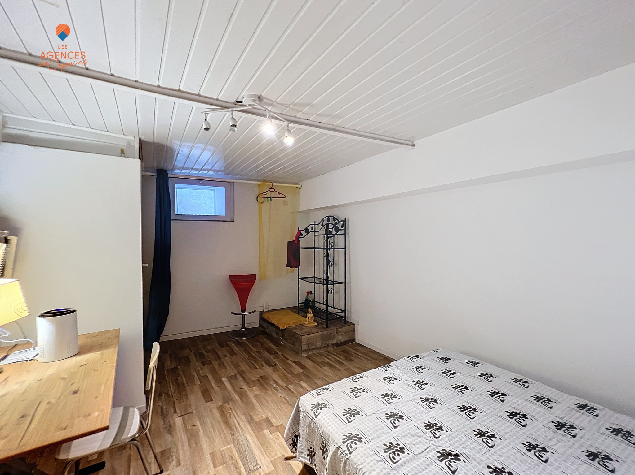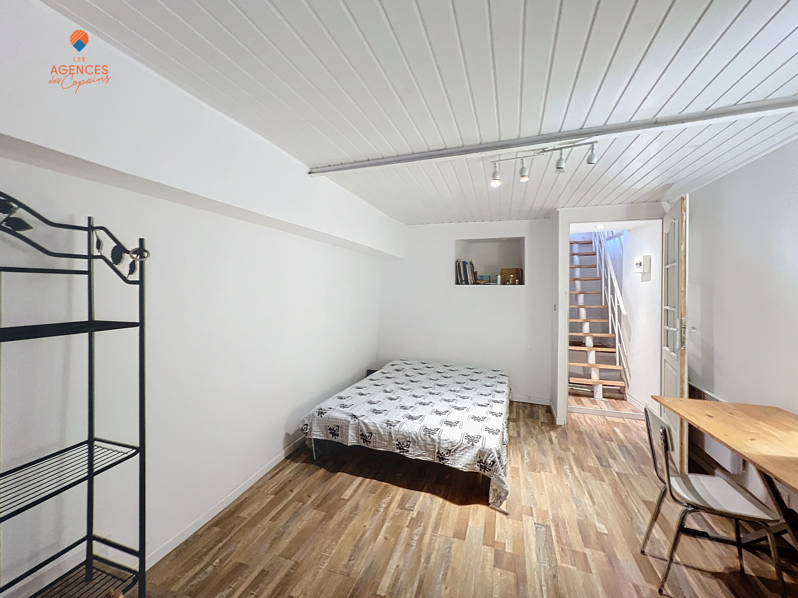 Salon salle-à-manger avec cuisine ouverte, chambre, salle d'eau avec WC, placards et buanderie, 2ème chambre en souplex de 14m², débarras.