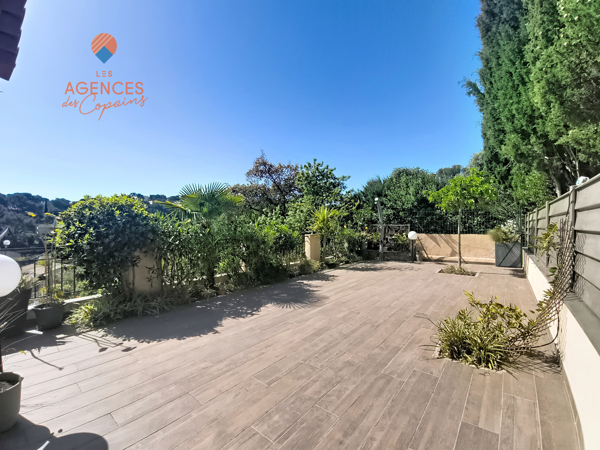 Grand salon séjour avec cuisine américaine, 3 chambres avec salle d'eau privative pour chacune. Chaque pièce donne sur très belle terrasse couverte ensoleillée. Une autre très grande terrasse de 70m² environ se situe sur le coté avec cabanon sans vis à vis. Cave et 2 places de parking couverts