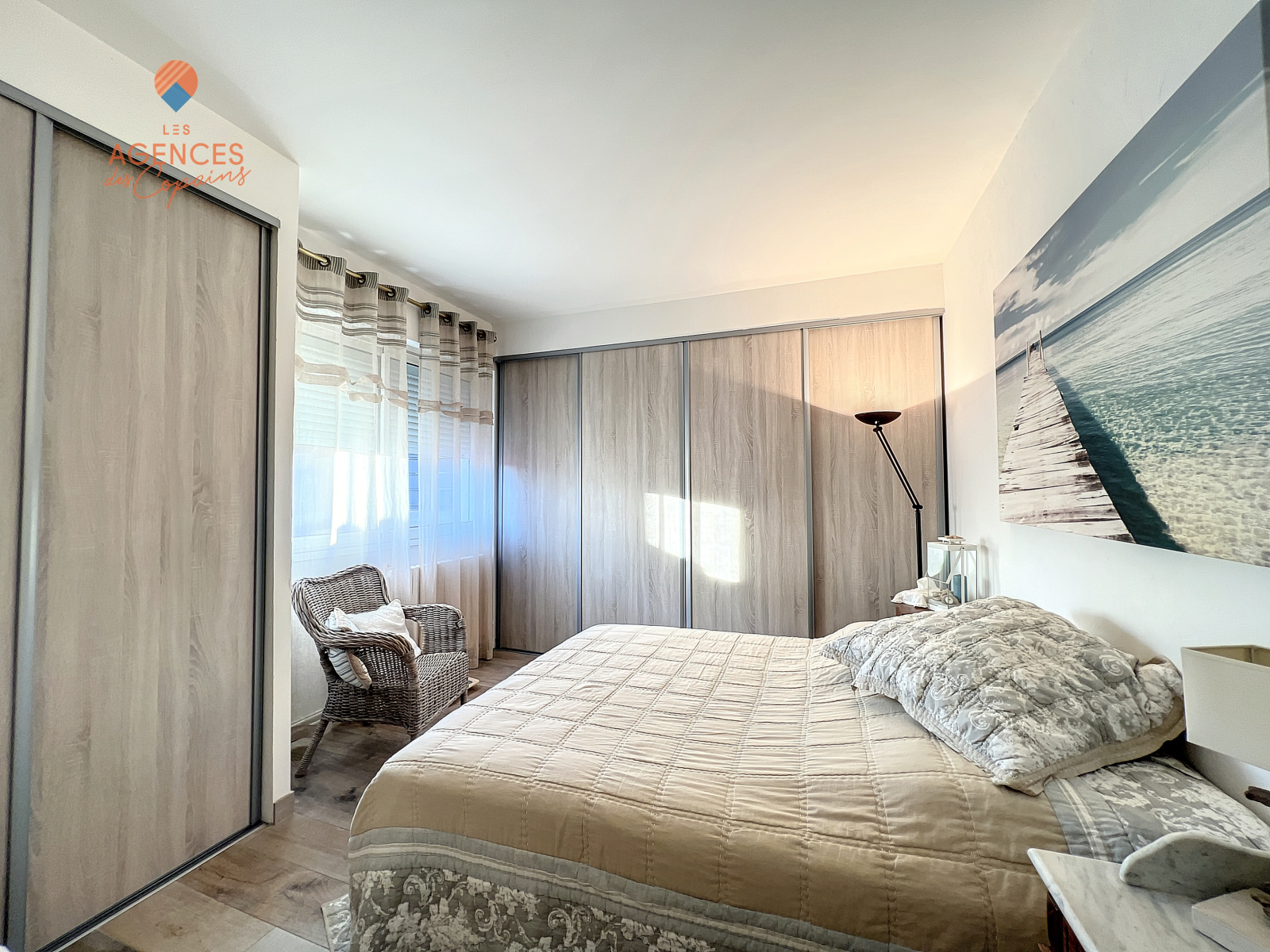 A l'étage: Un vaste 3 pièces de 77 m² avec petite vue mer, salon séjour ouvrant sur grande terasse sans vis à vis, cuisine équipée, 2 chambres, garage + 3 stationnements, climatisation réversible.