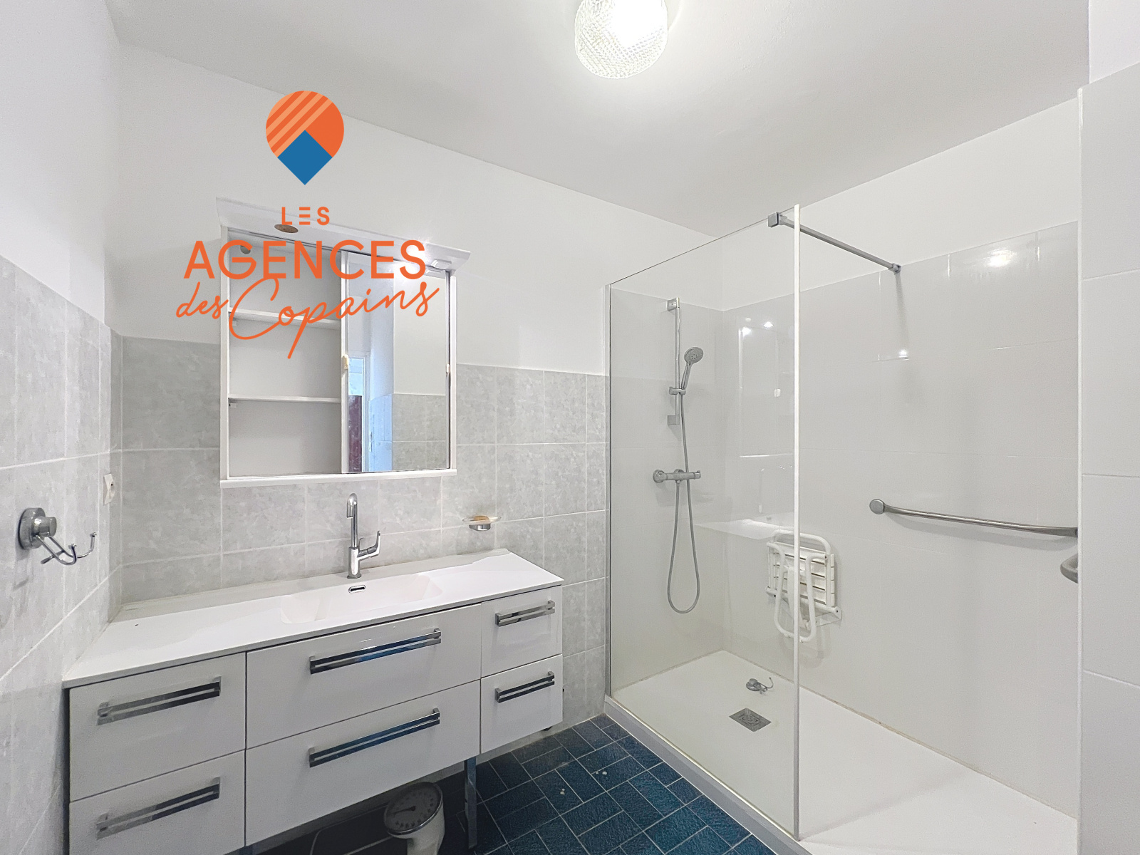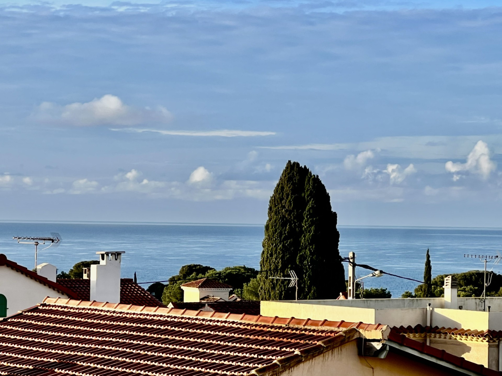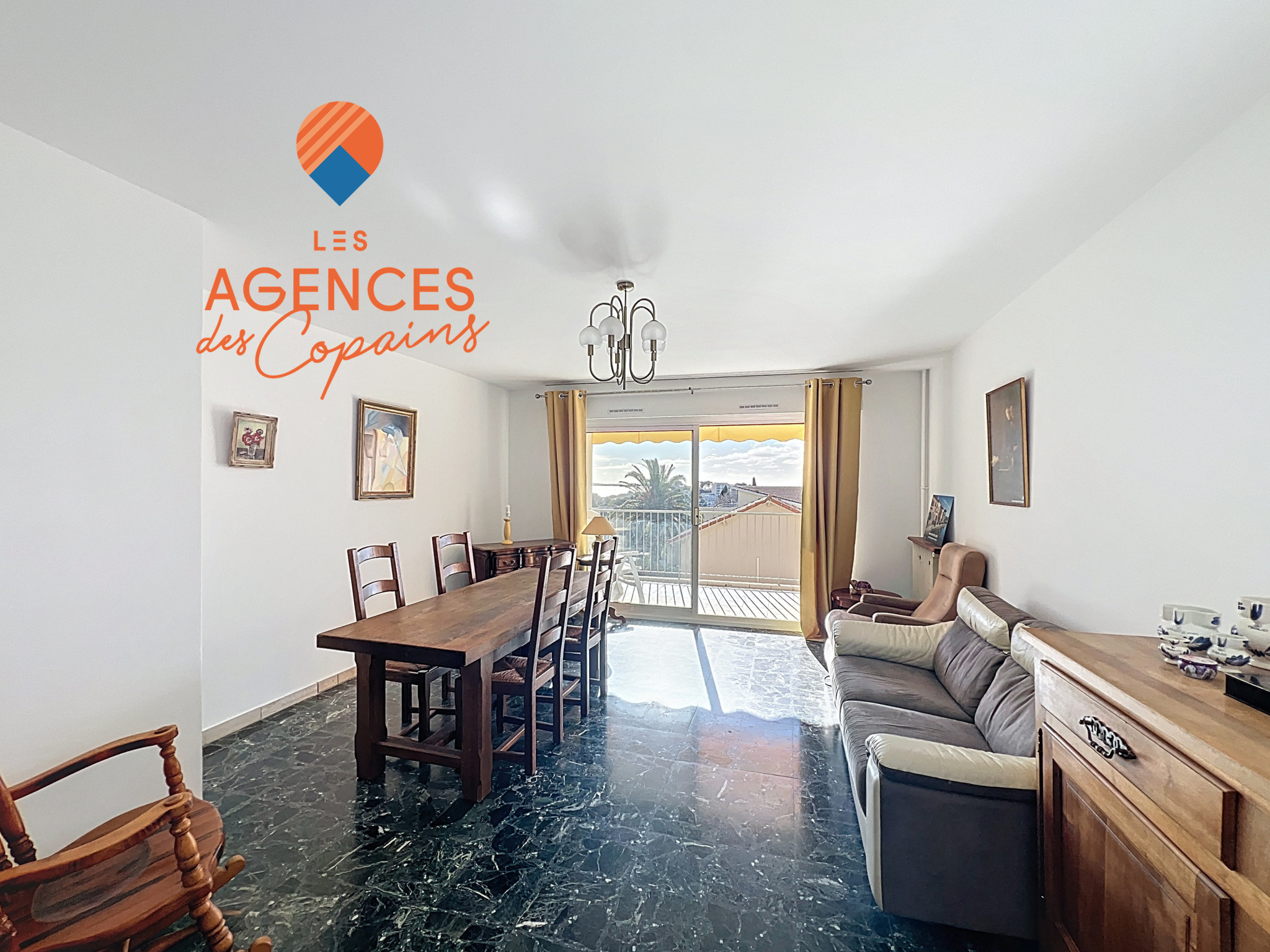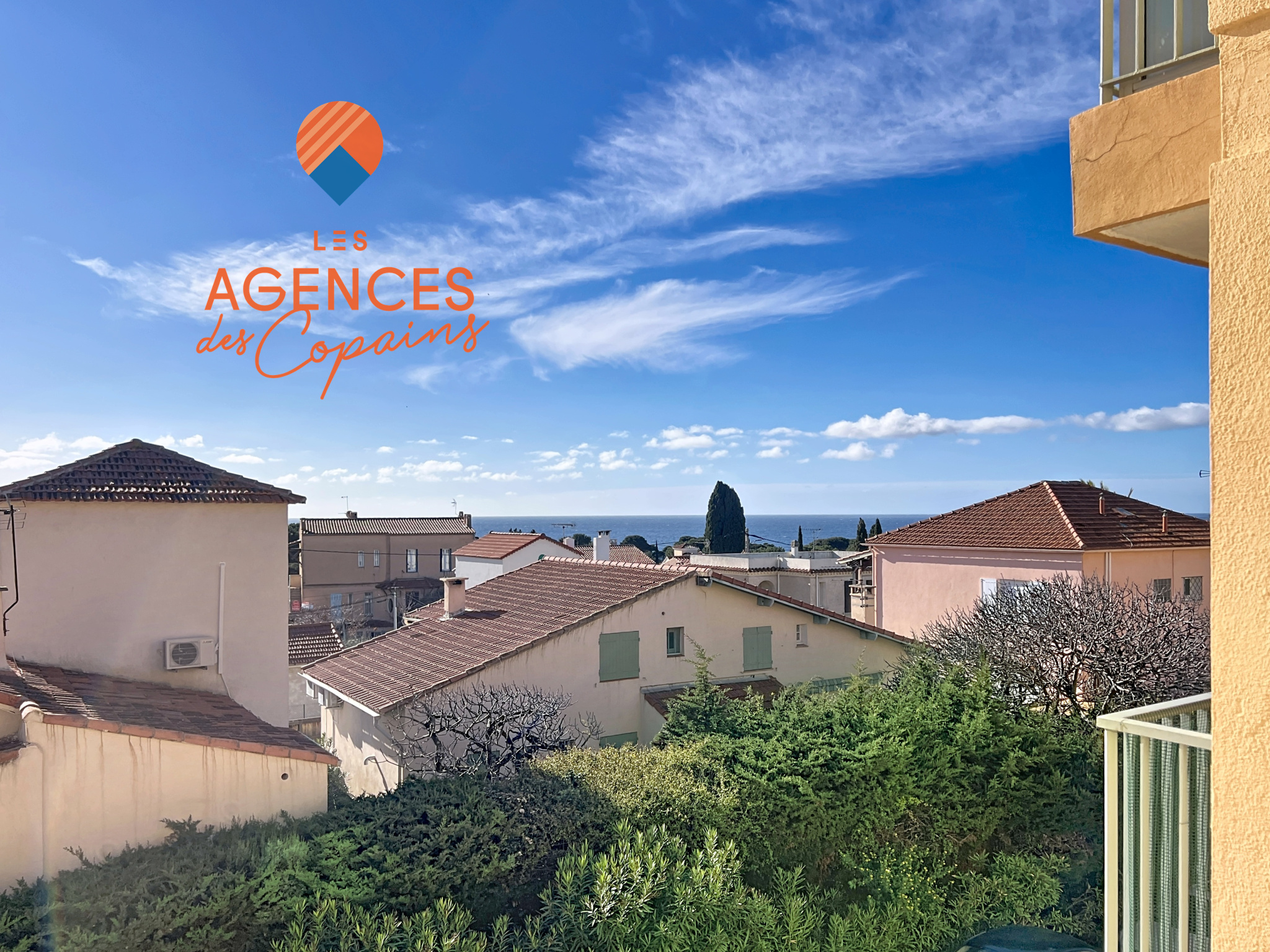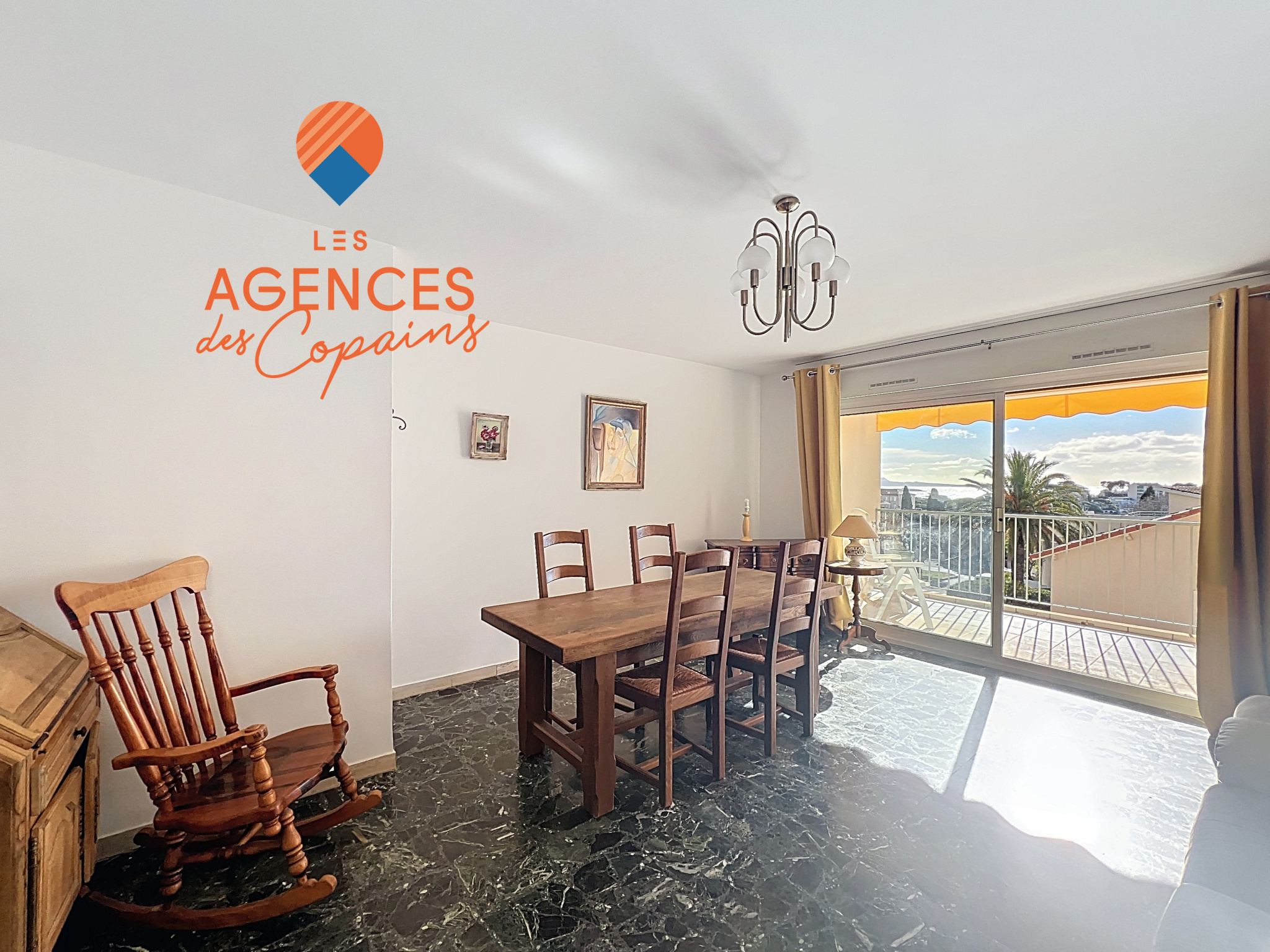 Grand séjour ouvrant sur la terrasse plein SUD, spacieuse cuisine équipée, deux chambres dont une de 16m² avec vue mer, dressing, salle d'eau, WC séparés.